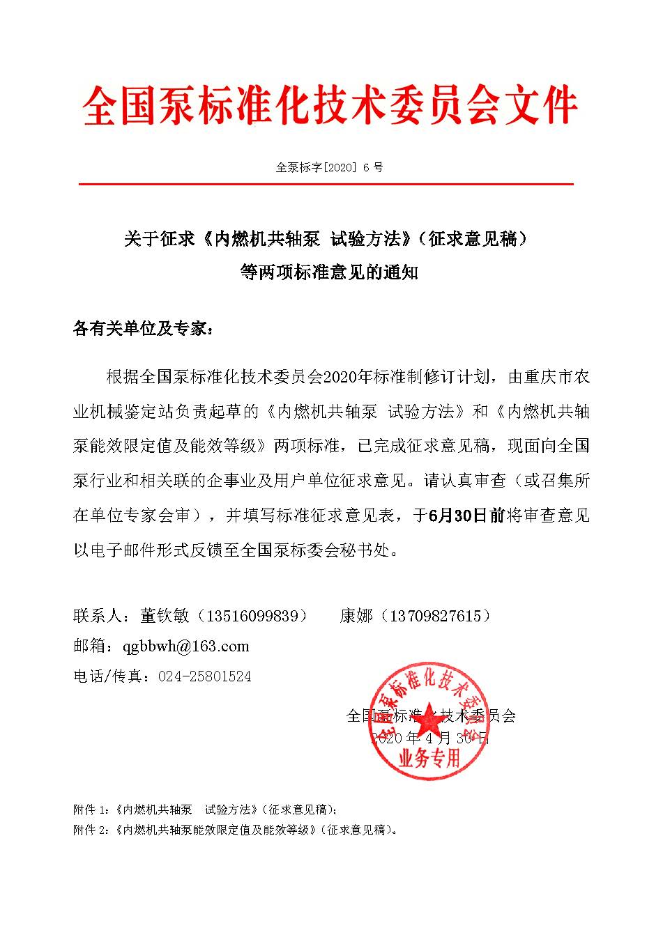 關于征求《內燃機共軸泵 試驗方法》(征求意見稿)等兩項標準意見的通知