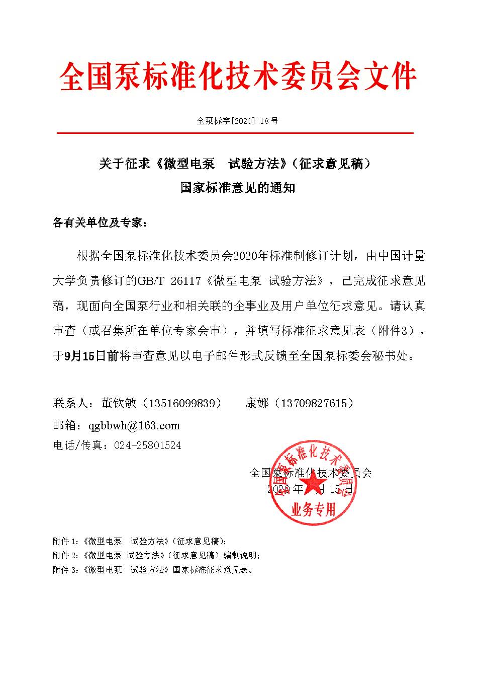 關于征求《微型電泵 試驗方法》(征求意見稿) 國家標準意見的通知