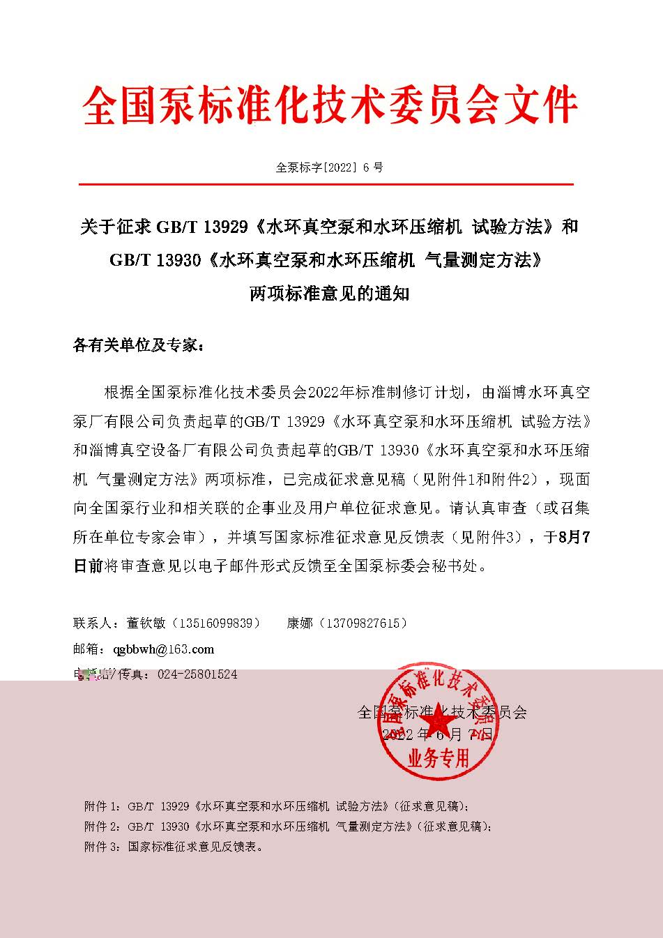 關于征求GB/T 13929《水環真空泵和水環壓縮機 試驗方法》和GB/T 13930《水環真空泵和水環壓縮機 氣量測定方法》 兩項標準意見的通知