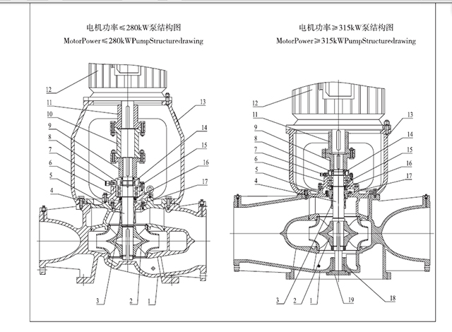 7、由于管道泵加長軸結(jié)構(gòu)的限制,一般功率配到90KW左右,水泵口徑到DN300左右。因?yàn)槿绻β侍螅脩粢院髶Q泵軸就得拆卸一臺大電機(jī)或者更換一臺大電機(jī),這個工作難度就太大了,而便拆泵目前可以做到配800KW的高壓電機(jī),口徑更是達(dá)到DN600左右,這些大功率的水泵在國內(nèi)各行業(yè)均有使用,使用效果非常好。